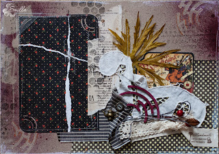 Вот мой четвертый разворот- Безумное чаепитие по Надиному проекту. Как всегда за основу взяла картон, побрызгала акриловой краской .И условие для первой страницы- это веточка. У меня веточка сорвана с дерева, а украшена бусинкам, которые покрасила красным лаком..